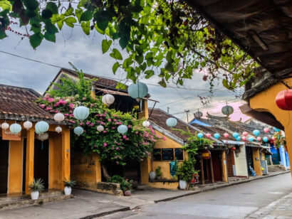 - Tiếp tục vào Hội An: nơi mà cuộc sống cứ bình lặng, nơi mà dường như dòng chảy vô tình của thời gian chẳng thể nào vùi lấp đi cái không khí cổ xưa. Những mái ngói cũ phủ đầy rêu phong, những con đường ngập trong sắc đỏ của đèn lồng, những bức hoành phi được chạm trổ tinh vi, tất cả như đưa ta về với một thế giới của vài trăm năm trước.